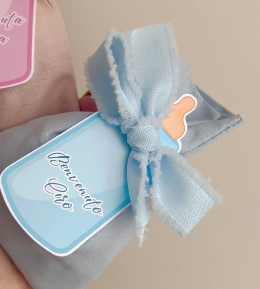 Sacchetto di stoffa per Nascita con tag personalizzato, maschio e femmina, rosa e celerse, biberon, maggiori info in descrizione