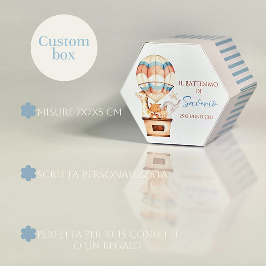 Scatolina Esagonale Battesimo – Mongolfiera & Animali Baby – Personalizzata con Nome e Data