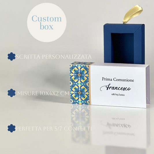 Scatolina a Cassetto Prima Comunione – Grafica Maiolica Blu & Oro – Personalizzata con Nome e Data - Bomboniera Comunione