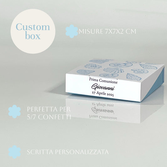 Scatolina Prima Comunione Tema Mare Conchiglie Azzurre – Personalizzata | 7×7×2 cm | Perfetta per 5/7 Confetti - Bomboniera Personalizzata