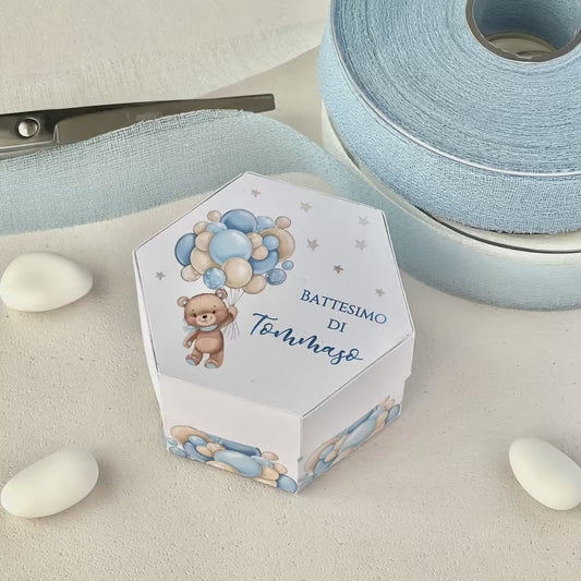 Scatolina Esagonale Battesimo – Orsetto con Palloncini Azzurri e Beige– Personalizzata con Nome & Data