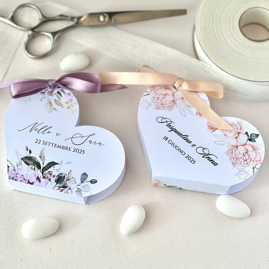 Scatolina Portaconfetti Cuore Personalizzata • Bomboniera Matrimonio/Comunione/Battesimo • 5 Grafica Florali • Fiocco in Raso • 5 Confetti