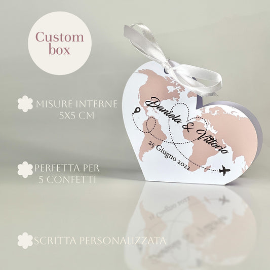 Scatolina Cuore Mappa del Mondo – Bomboniera Viaggio Personalizzata Perfetta per Matrimonio, Anniversario, Wedding Travel Theme