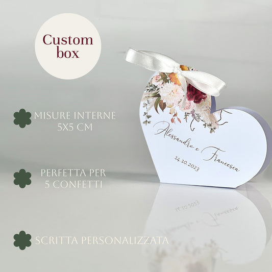 Scatolina Cuore Matrimonio – 5×5 cm Grafica Floreale Boho | Perfetta per 5 Confetti | Personalizzata con Nomi & Data - Bomboniera Matrimonio