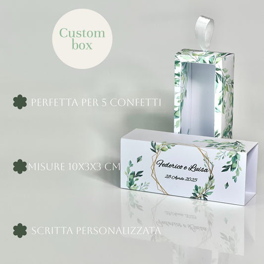 Scatolina Portaconfetti a Cassetto – Grafica Foglie Green – Personalizzata con Nomi & Data - Bomboniera Matrimonio