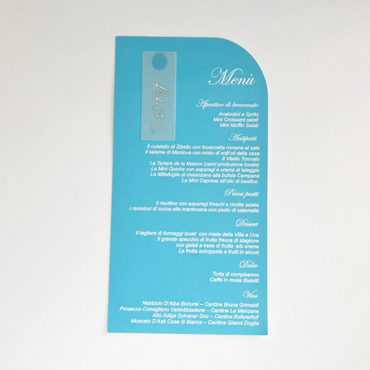 Kit Invito, segnatavolo, menu per Compleanno, celeste,bianco e argento, maggiori info in descrizione