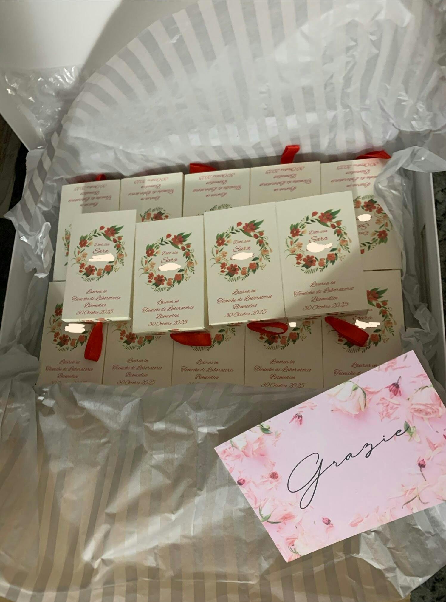Scatolina realizzata con cartoncino martellato 250g. Specificare nella personalizzazione il tipo di scatolina - corona di alloro o corona di fiori rossi.