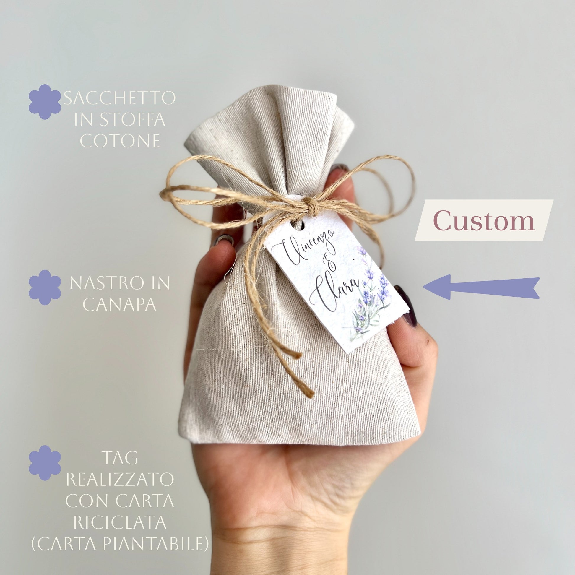 Sacchetto Bomboniera in Stoffa con Tag in Carta Piantabile – Personalizzato – Nastro in Canapa – Matrimonio Eco Chic