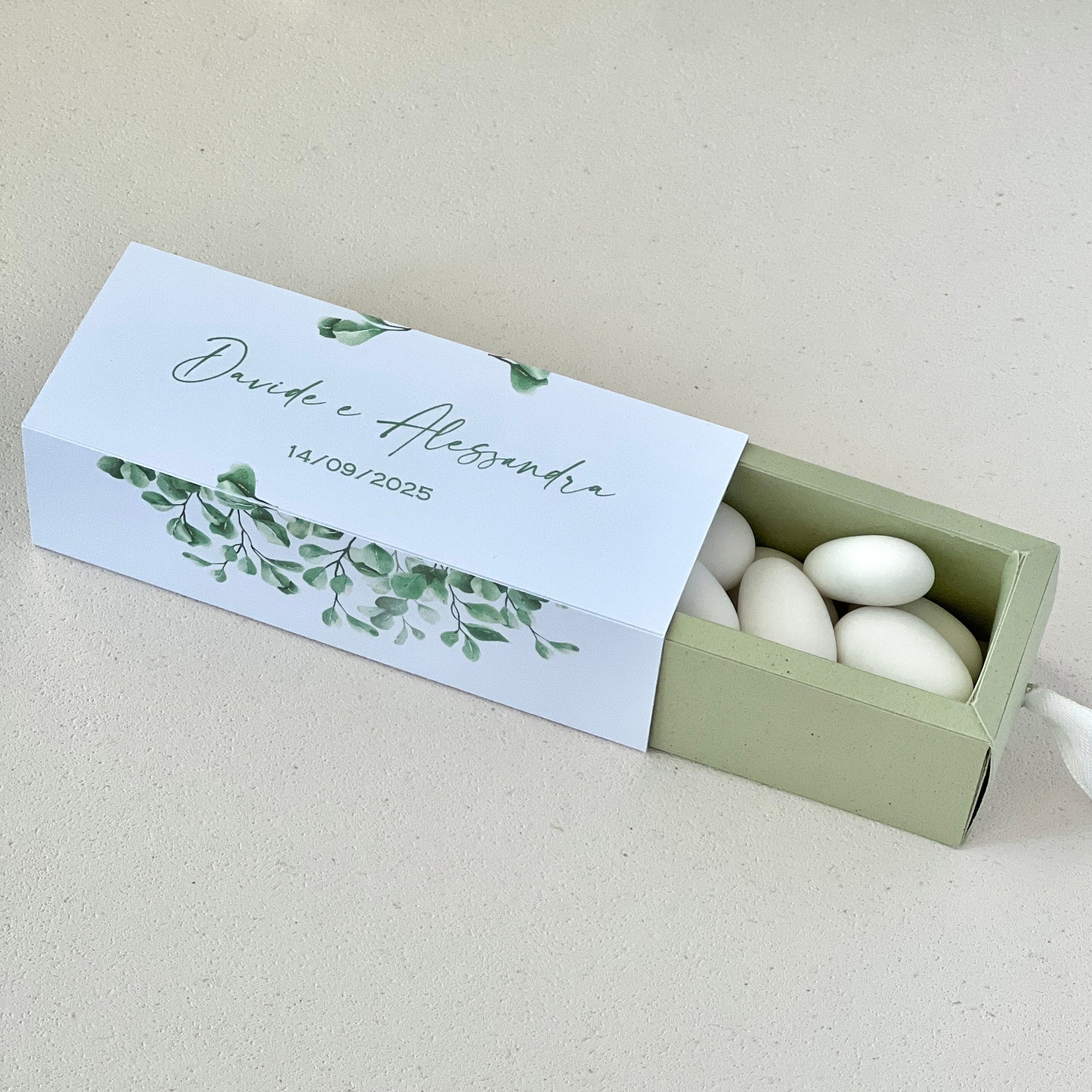 Scatolina Matrimonio Green Sage – 10×3×3 cm Interno in Cartoncino Riciclato Verde Salvia | Personalizzata | Bomboniera Personalizzata