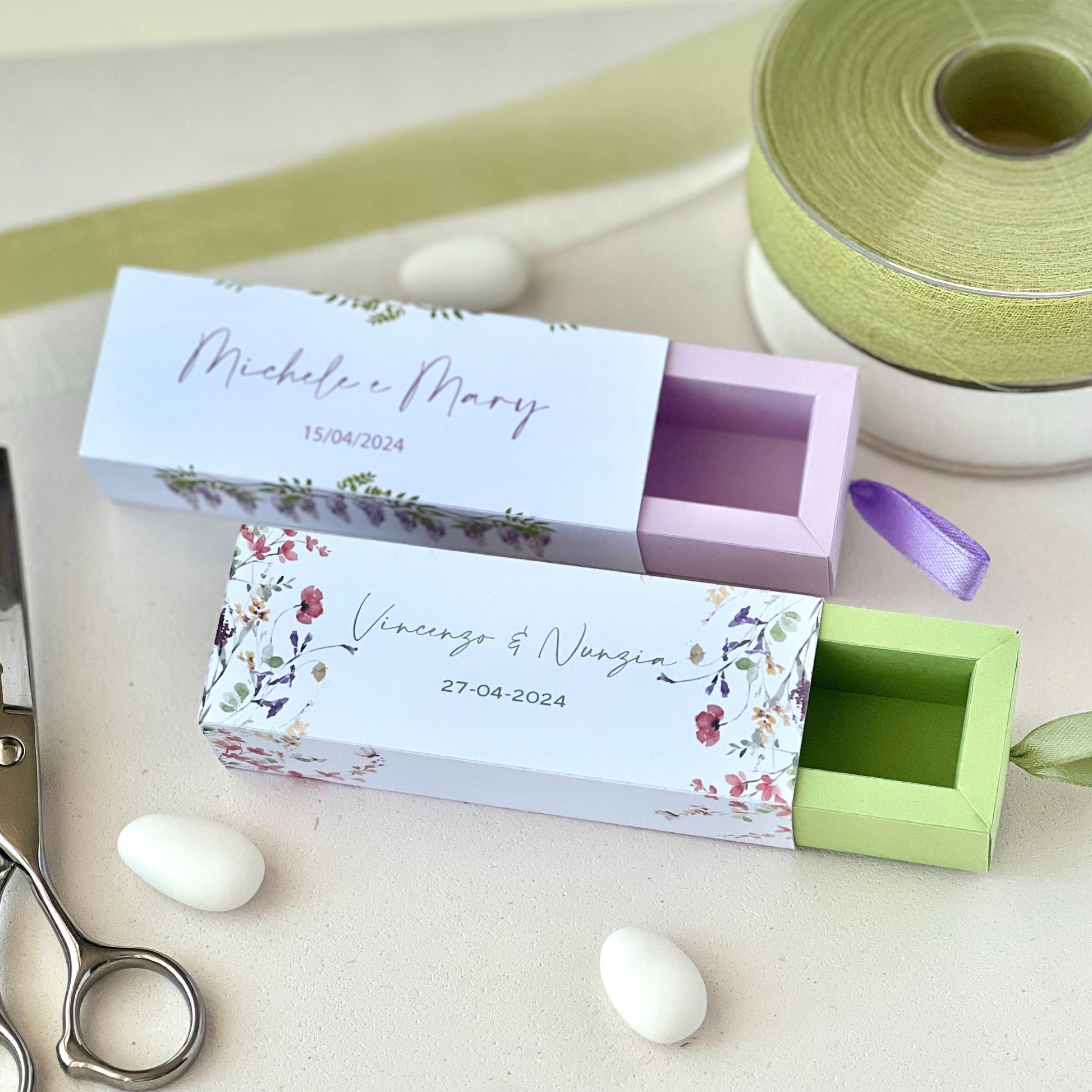 Scatolina Porta Confetti Personalizzata – 2 Grafiche Floreali – Bomboniera Matrimonio / Promessa / Evento – Custom Box con Nastro