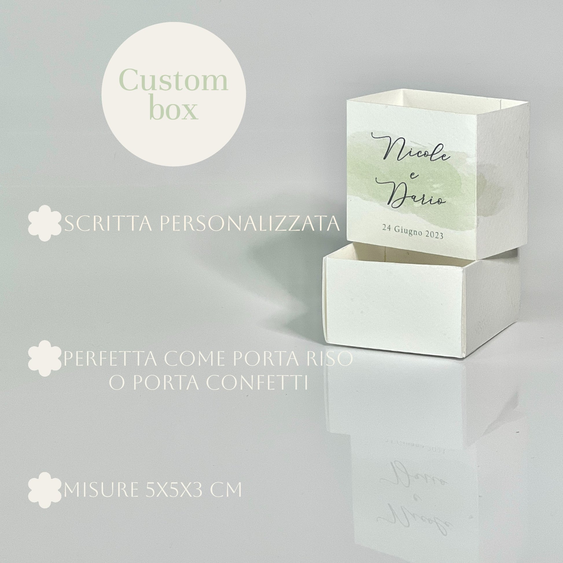 Scatolina Porta Riso/Confetti Avorio – Grafica Acquerello Verde o Celeste – Personalizzata per Matrimonio